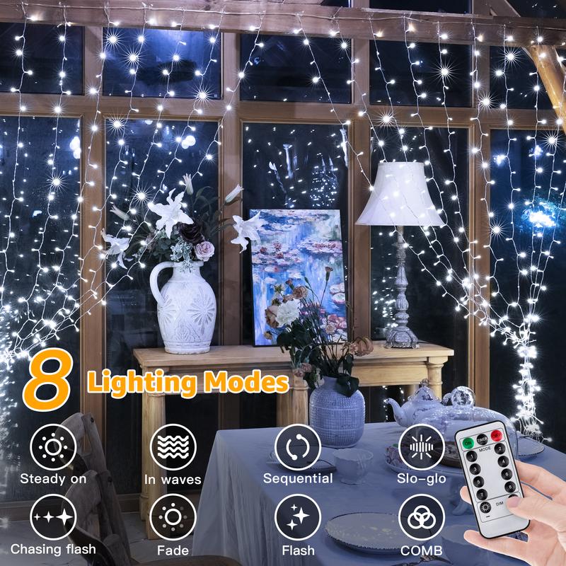 [8 Light Modes]: The window lights comes with 8 light modes, including steady on, flashing, gradient, and more, The charming Hanging Christmas curtain lights will create a more warm, romantic, cheerful, and relaxed atmosphere, you can adjust different modes according to different occasions